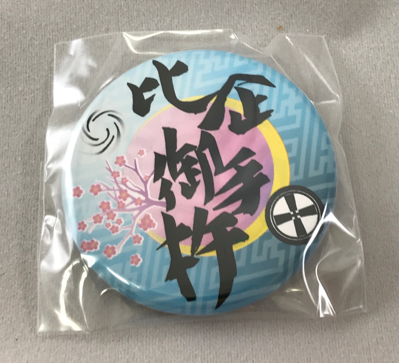 比企御手杵のマークと文字の中くらいの大きさの缶バッチ